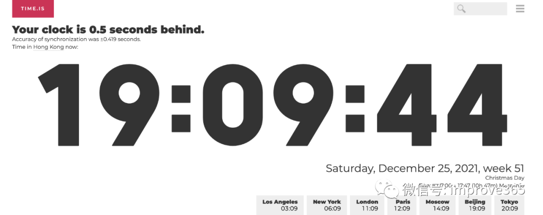 计算机或智能设备大多采用 NTP 协议来同步时间。你还可以访问 time.is[10] 这个网站来查看你的设备与高精度原子钟的时间偏差: