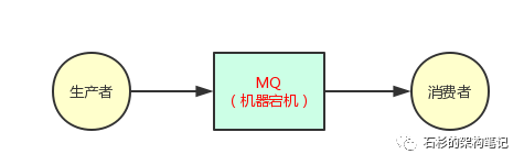 大家看看下面的图,其实道理很简单。假设你的 MQ 就部署在一台机器上,那么正常情况下,生产者都会发送消息到 MQ 去,然后让消费者获取到。