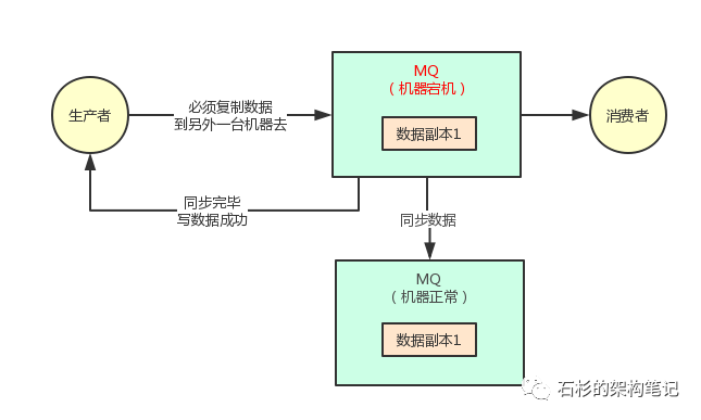 所以对于采用这种机制的时候,你必须得让生产者通过一些参数的设置,保证写一条消息到某台机器,必须同步这条消息到另外一台机器成功。等到集群里有双副本了,然后才可以认为这条消息写成功了。