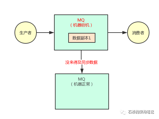 只要刚写一台机器他就宕机,还没来得及复制到另外一台机器的话,本次写应该报错失败。然后,你应该重试再次写入数据到 MQ 集群里去。
