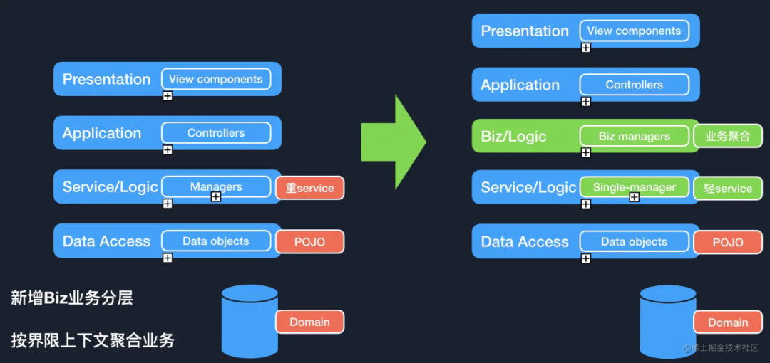 大多数单体架构都是面向过程的设计,domain 层充斥这个各种 DTO、VO、BO,所以在层与层的数据交互过程中,大都是经历了多次的 POJO。另外就是 Service 层充斥着和 DAO 层数据交互以及参杂了业务,而且严重违反了依赖倒置原则,整个层变得非常的沉重。这里举个例子: