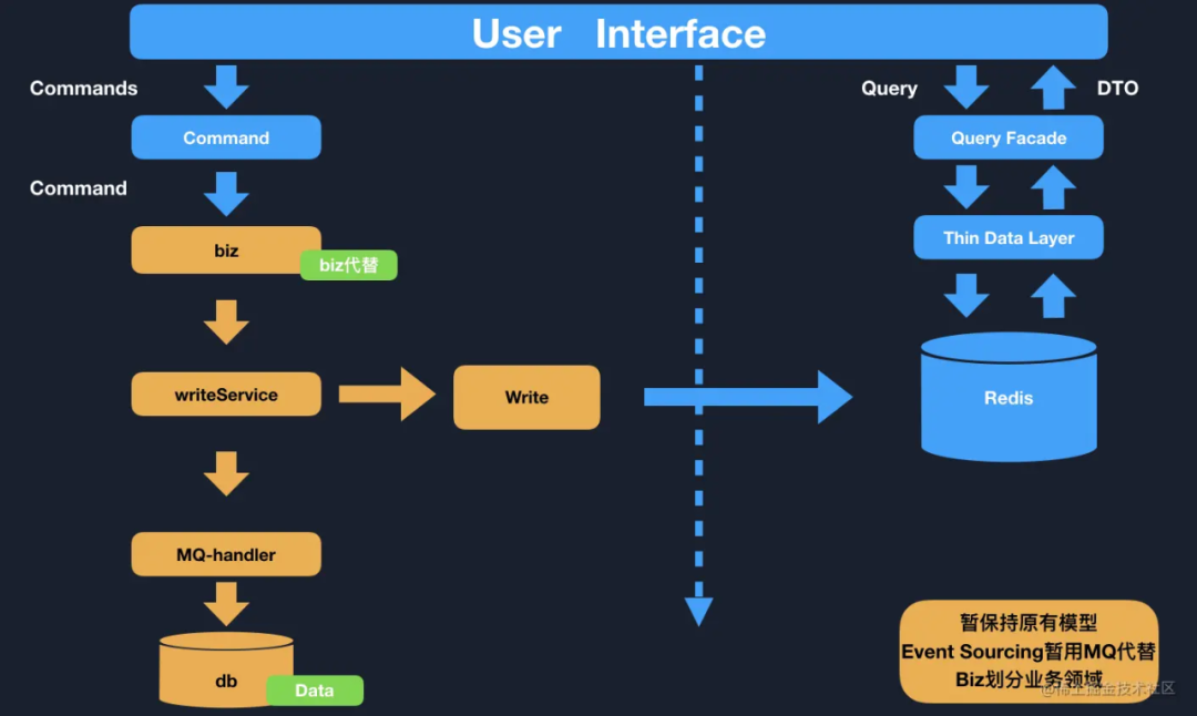 上面我们也提到了,进行了整体功能的拆分,并没有对具体的读写服务的拆分。在面向服务的场景下,功能里也是分读服务、写服务。那么我们有什么原则来指导读写服务的分离么?那就是 CQRS 的思想:命令职责查询分离,不单单指代码,同样也是适用于服务。