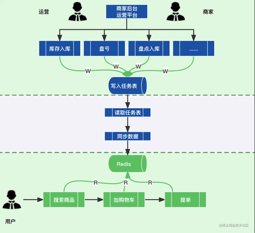 库存通过这套设计强依赖了 Redis 来作为库存查询、修改的中间件。保障了数据的强一致性。库存在原有的服务上,分离了读写,保障了系统的 CQRS 命令职责查询分离。