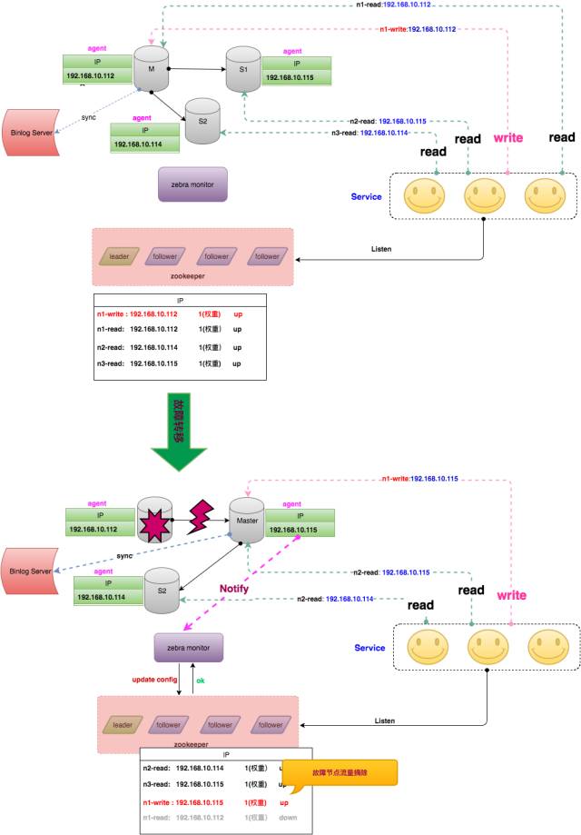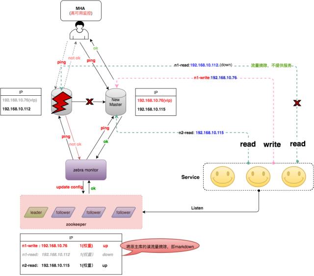 当 MHA 切换完成之后,主动发送消息给 Zebra monitor。Zebra monitor 更新 ZooKeeper 的配置,将主库上配置的读流量标记为下线状态。