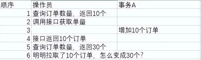 举例:操作员查询可生产单量 10 个,调用接口下发 10 个订单,事务 A 增加 10 个订单。操作员获取 10 个订单落库,查询 发现变成 30 个订单。5 事务隔离级别