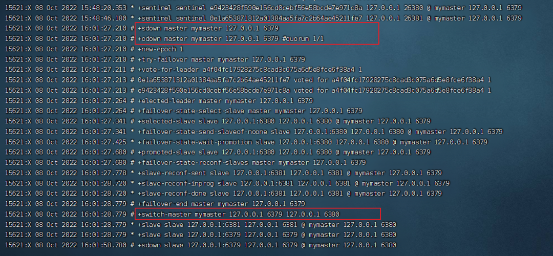 哨兵检测到了 6379 下线,然后选举出了新的主库 6380