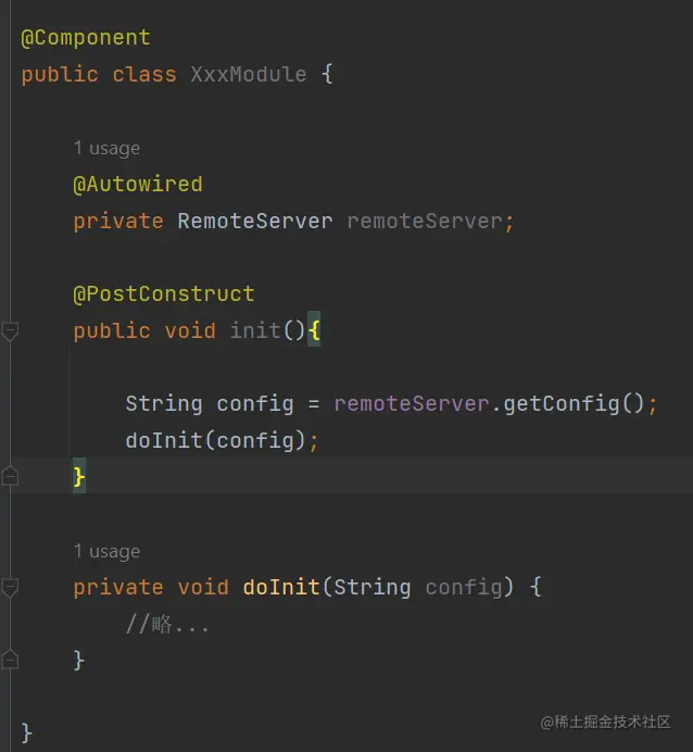 然后里面有一个类,有个方法加了 @PostConstruct。但是由于某些外部原因,这个方法会抛异常,因此本地服务起不起来,也没办法进行功能测试(比如这个 RemoteServer.getConfig() 抛异常)。