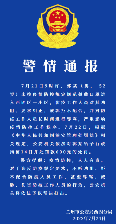 7月24日,兰州市公安局西固分局就一起违反防疫规定行为发布警情通报: