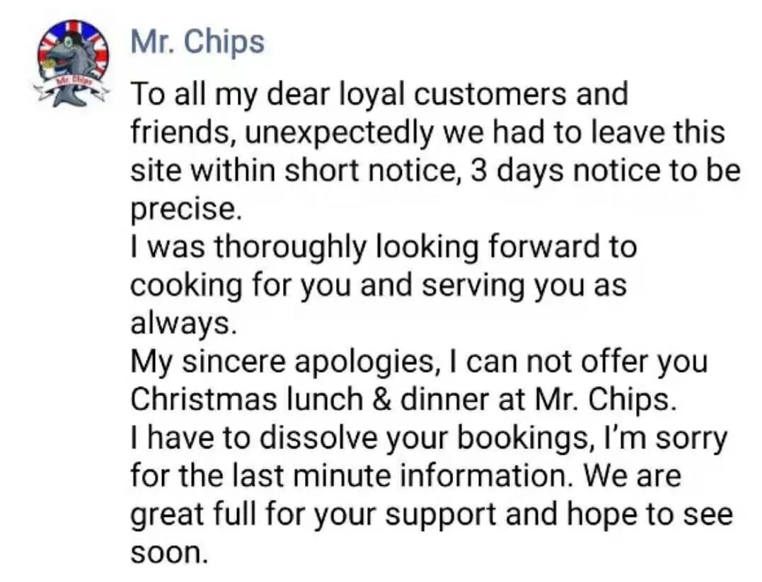 The latest example of the change came on Thursday evening when upscale fish and chips restaurant Mr. Chips posted a message online explaining how they had been given three days' notice to ship out. News of Mr. Chips' departure from the venue is not a huge surprise – in my review of the restaurant, I mentioned how the lackluster surroundings hinted that they might not be around for long – but the closure is no less saddening given the high quality of the food.