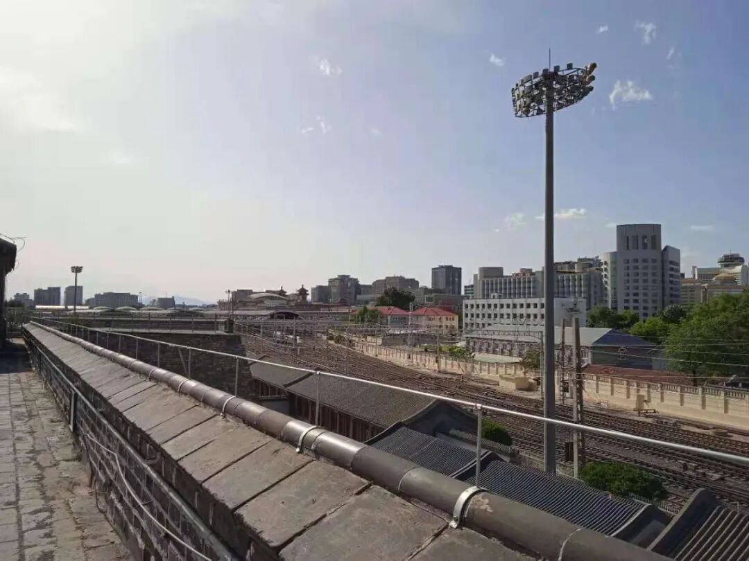 Trainspotting from atop the wall, Beijing Railway Station in the distance.