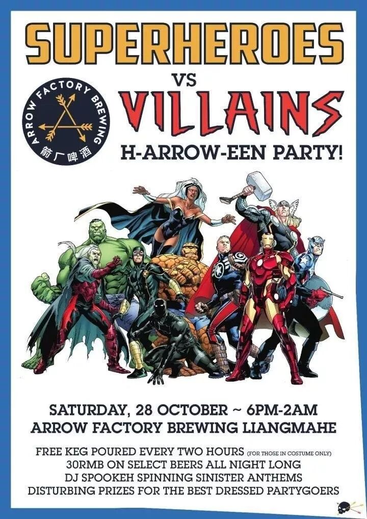 Ladies who ordered a Wonder Woman costume: head over to the superhero vs. villain-themed H-Arrow-Een party at Arrow Factory Brewing Liangmahe. They’ll be pouring out a free keg of beer for those in character every two hours via the "Beer Wheel of Death." They’ll also be offering select beers for RMB 30 all night. DJ Spookeh will be spinning his selection of sinister anthems to get your blood really pumping, and there will, of course, be a costume contest with "disturbing prizes." Free. 6pm. Arrow Factory Liangmahe.