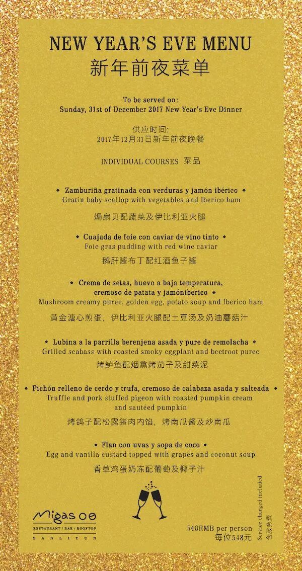 NYE is Migas Sanlitun's last ever shindig so head over early and start the evening with dinner first before drowning your sorrows. Migas is serving a six-course menu including dishes like grilled sea bass and truffle and pork stuffed pigeon. Price of dinner includes a ticket to the NYE party. RMB 548. 5.30-9pm. Migas Restaurant and Lounge