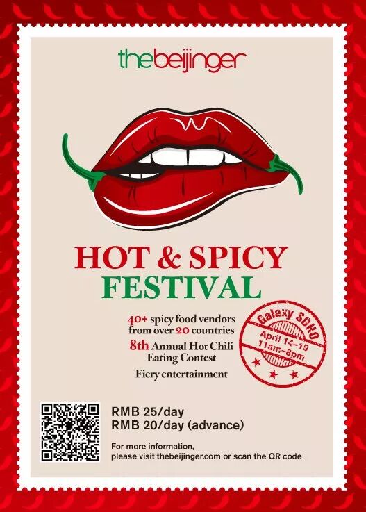If that has got you salivating and a strong urge to eat spicy foods of the world, scan the QR code below to secure your tickets for our Apr 14-15 Hot & Spicy Festival at Galaxy Soho (11am-8pm). As well as your free Beijinger-branded bandana if you purchase advance tickets (RMB 20), here's a reminder of what else will be packed into the two-day fest: