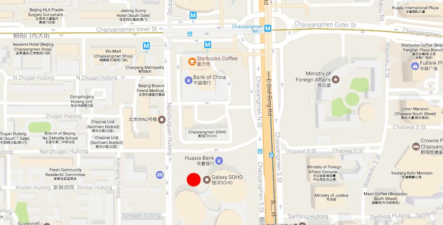 If you're planning to get there by taxi, you can ask your driver to take you to 银河soho (yínhé soho) or 朝阳门桥东南角 (cháoyángmén qiáo dōngnánjiǎo, literally "the southeast corner or Chaoyangmen bridge").