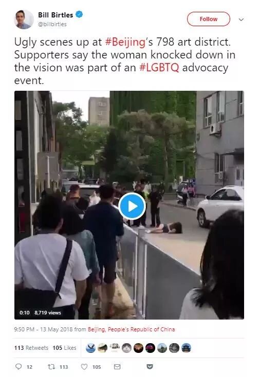 Bill Birtles, China correspondent for the Australian Broadcasting Corporation (ABC) tweeted a link to the footage in which a crowd can be seen tussling before a guard visibly strikes a woman to the ground. “Ugly scenes up at #Beijing’s 798 art district,” he wrote, adding, “Supporters say the woman knocked down … was part of an #LGBTQ advocacy event.” You can see that clip here (VPN required): twitter.com/billbirtles/status/995662653296033792.