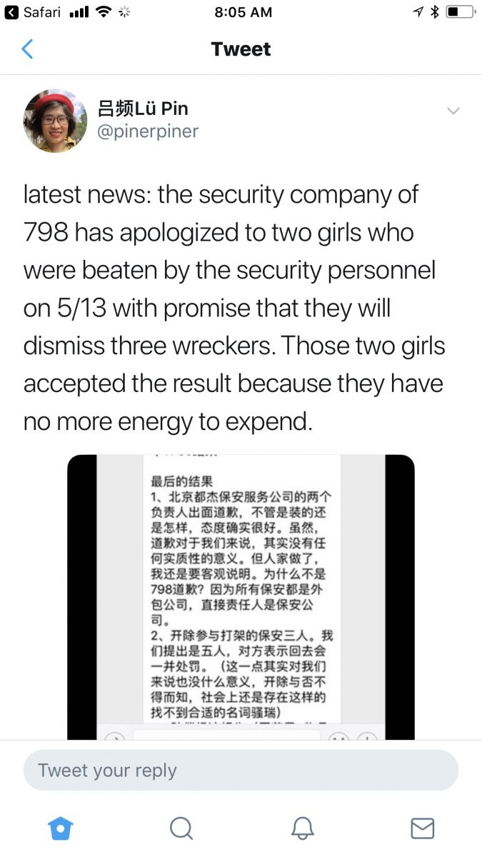 Lü has since Tweeted, "Latest news: the security company of 798 has apologized to two girls who were beaten by the security personnel on May 13 with promise that they will dismiss three attackers. Those two girls accepted the result because they have no more energy to expend."