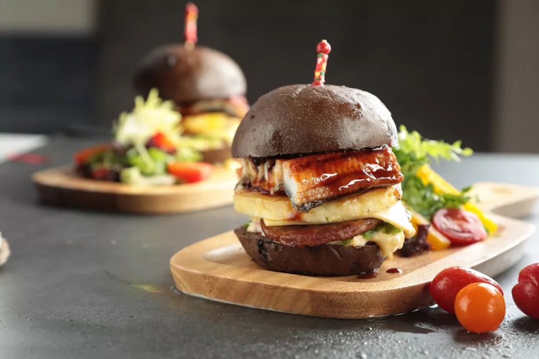 each stacked with a smoky patty, gooey Emmental cheese, tomato, purple