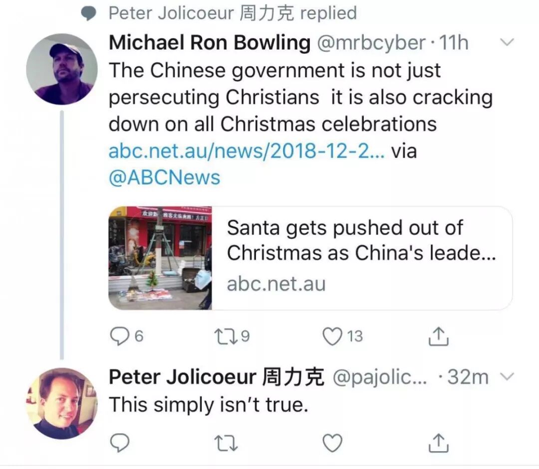 He went on say that “media companies probably need to get their facts straight." He concedes that anti-Christmas measures might be "happening in some small cities, but it's not happening everywhere. Every mall and store I went to in Beijing was full of workers dressed as Santa, decorations and Christmas songs. It was almost too much!”