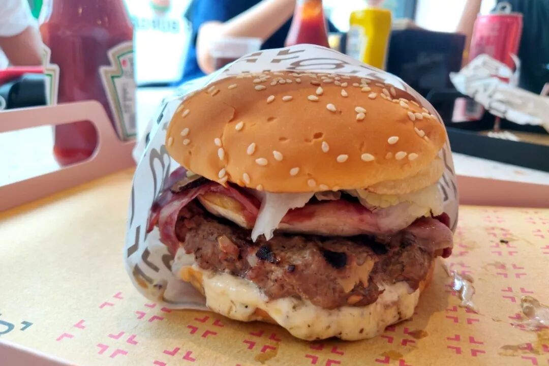 After starting off the summer with a new vegan menu, Moka Bros has taken a swing in the opposite direction with Burger Box, a no-fuss burger joint situated just next door to their Nali Patio location. The decor is borderline austere, with a single terrazzo table inviting customers to dine communal style and nod along to classic rock blaring from the speakers. There's also some outdoor seating should you want a quieter, more intimate setting for you to get dirty with your burger.