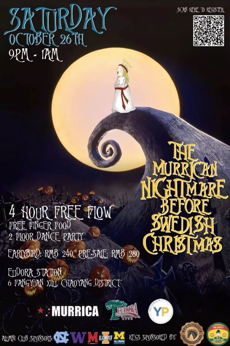 The Murrican Nightmare Before Swedish Christmas PartyWhat's this? What's this? Another Murrica Halloween party of course! This time Murrica has teamed up with the Swedish Young Professionals to ensure their Halloween bash will be a spooky (and vaguely cross-cultural) success. Four hours of free-flow spirits (not the ghostly kind), beer, and finger food will be available throughout the night and there will also be a costume contest, where the winner will receive a free ticket to the Swedish Sankta Lucia Christmas Party. RMB 280. 9pm-1am. Eudora Station