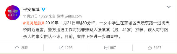 Weibo page stated that a 41-year-old male suspect killed the student on an overpass close to East Tiantan Road (天坛东路 tiāntán dōng lù) in Dongcheng District at around 6.30am on Thursday, Nov 21. The suspect has pleaded guilty to the murder.