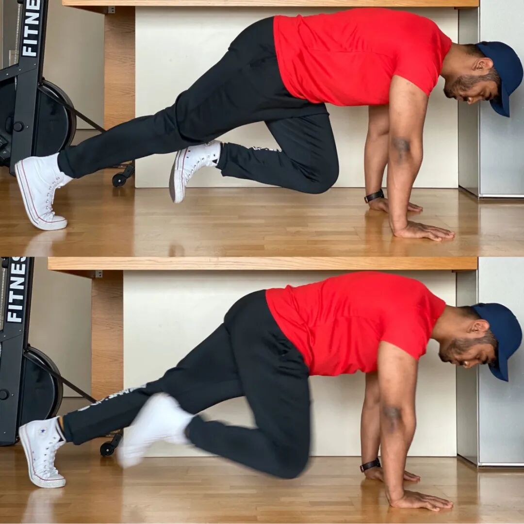 Mountain climbers: Assume a high plank position. Alternate kicking your legs up to your chest.