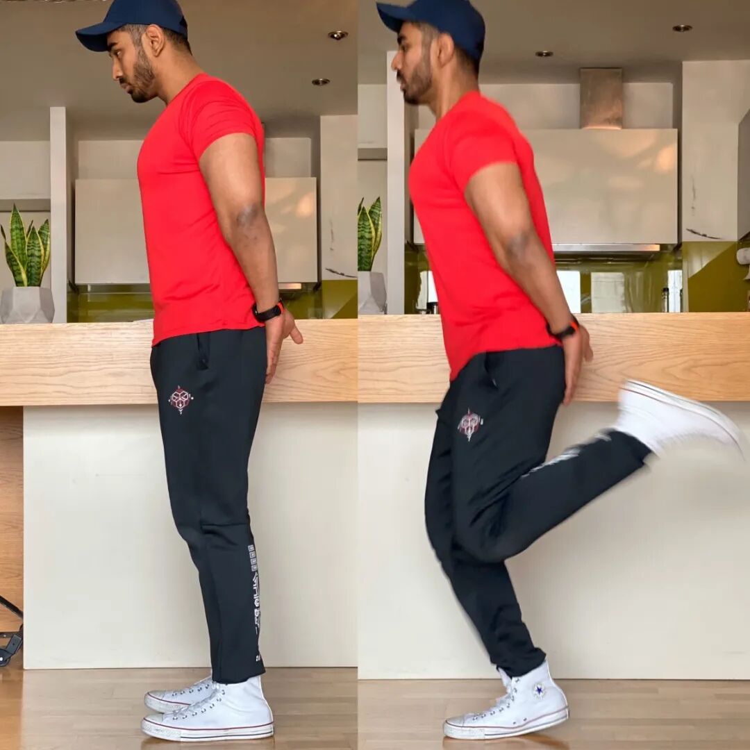 Standing alternate heel touchers: On your feet, try to tap your heel by lifting your sole up to your hand in quick repetition. Switch sides and gradually speed up.