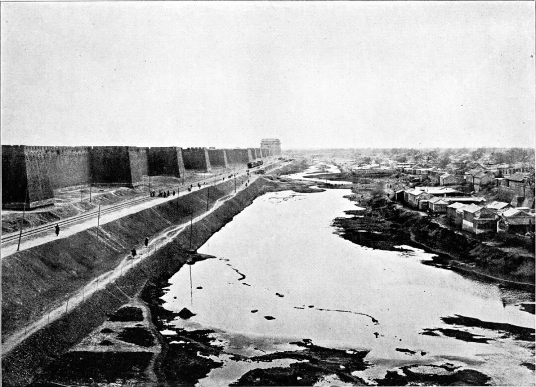 The city wall from Chongwenmen to the Southeast Corner Tower in the early 1900s overlooking the moat and the Huashi neighborhood