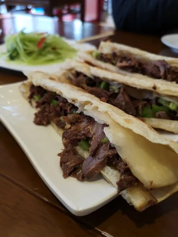 肉夹馍 ròujiāmó are often referred to as "Chinese burgers" but we can't help but feel like that kind of under-sells them. The mix of long-braised meat (usually pork in Beijing but traditionally beef or lamb) and dense baked bun is supremely satisfying (ask for added green peppers and cilantro for a vegetal upgrade). Roujiamo are often enjoyed as a cheap snack alongside a bowl of noodles, such as those at Ling Er Jiu near Chunxiu Lu, but we're also partial to the cute miniature version served at upscale Shaanxi restaurant Zhen Ai Zhongguo.