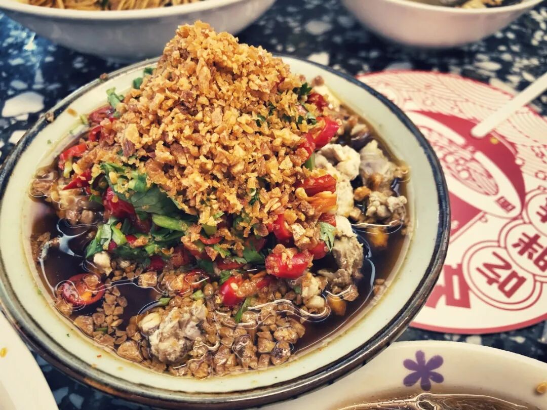 Besides the noodles, there are many other à la carte dishes for you to choose from, such as beef offal stew, spicy diced lotus, or even spicy pig brain. We opted for the old-fashioned chicken, a small bowl of tenderly cooked and finely chopped chicken marinated in a savory spicy sauce and topped with fresh chili pepper, cilantro, fried garlic, and scallions. The aroma is mouth-watering in and of itself, and each piece of chicken soaks up the sauce well. This chicken is swimming in a delicious, savory bath
