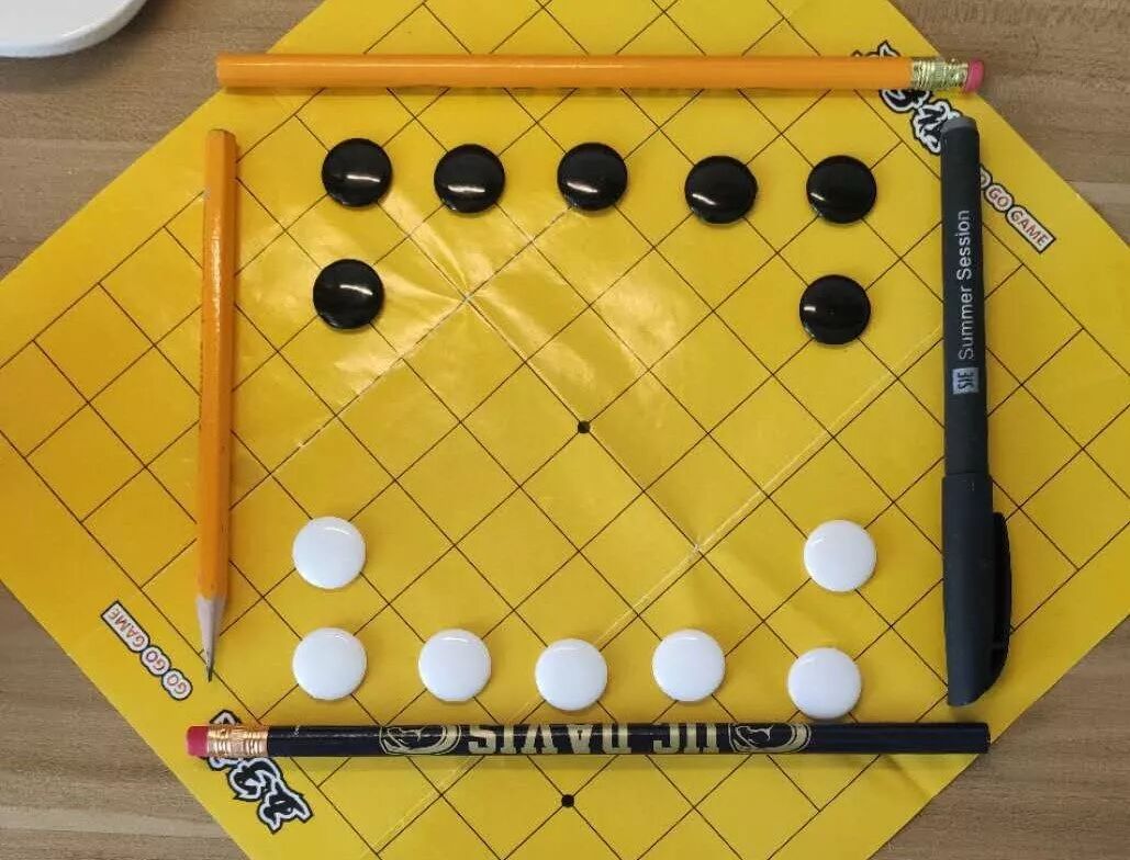 The starting position for five-field kono. The game is played on a 5x5 board, so I have used pencils to demarcate the board edges.