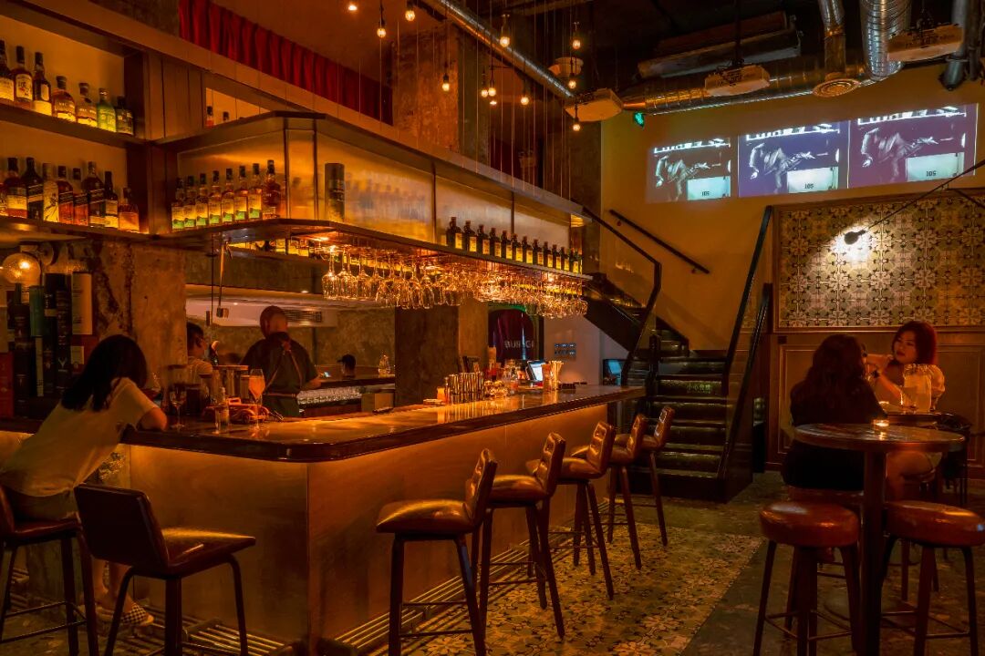 The interior is done up in swanky lounge style, with dim lighting, muted tones, soft couch seating along the back wall, and café style seating in front. In the center is a well-stocked bar that mixes some impressively original cocktails, such as the Bistro Kitchen (RMB 68): a Gin and Tonic with a dash of flavor from basil, olive, tomato and aged black vinegar.