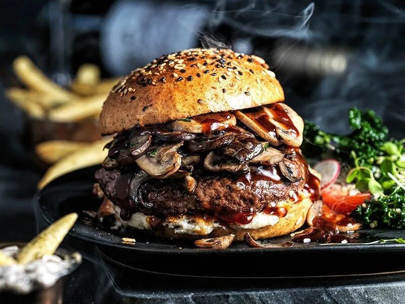 cheeseburger with all the fixings, topped with a hearty mushroom encased