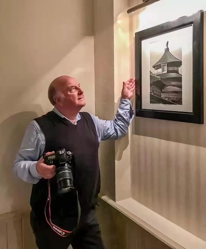 Connolly looking at one of his photographs, which was chosen for the interior decoration of the Hilton Beijing Hotel's One East Grill, 2018