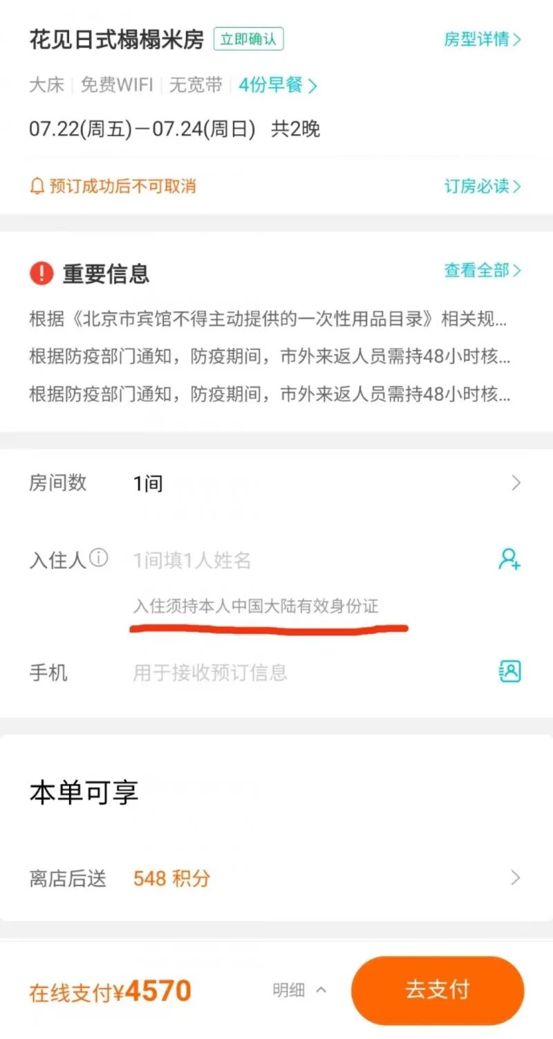 It should be noted that on some booking pages it’ll say 入住须持本人中国大陆有效身份证 rùzhù xū chí běnrén zhōngguó dàlù yǒuxiào shēnfèn zhèng next to their 入住人 rùzhù rén (occupant) function – which means, in other words, only folks with Chinese ID can stay.