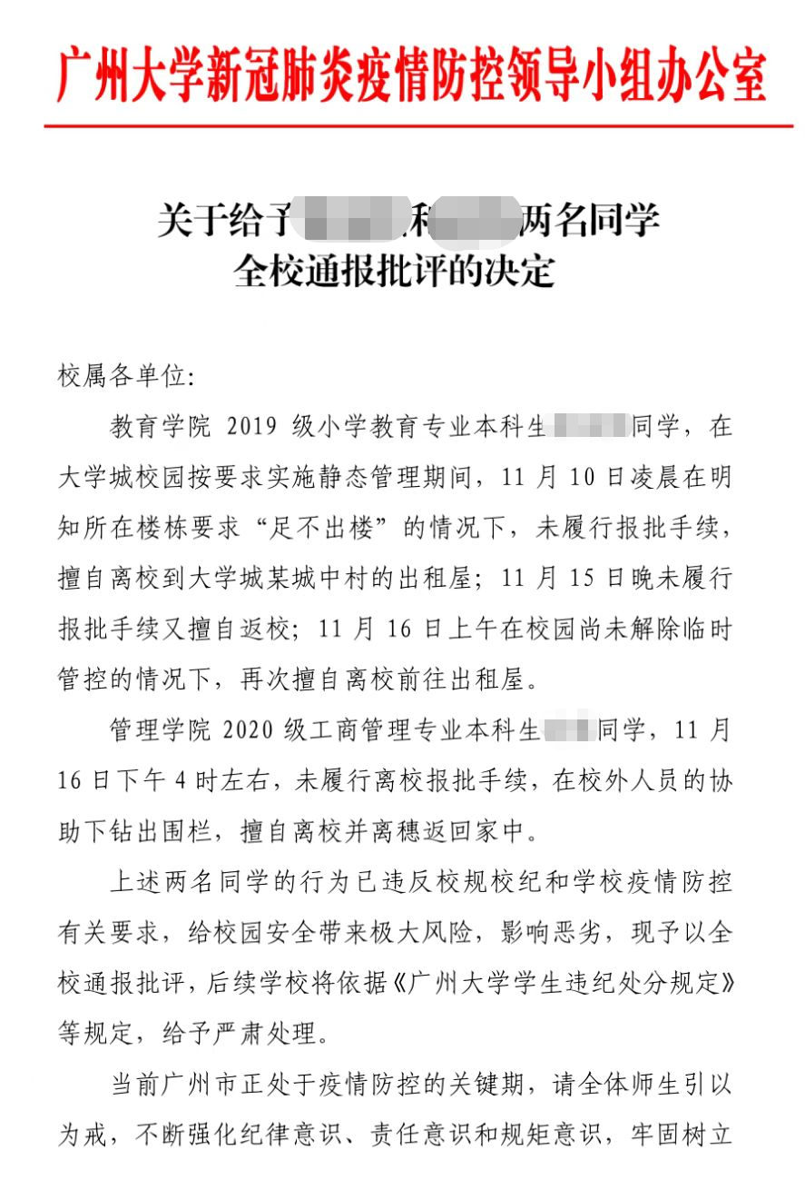 近日,广州大学发布一则通报。通报表示在大学城校园实施静态管理期间,两名学生擅自离校,违反校规校纪和学校疫情防控有关要求,现予以全校通报批评,后续学校将给予严肃处理。