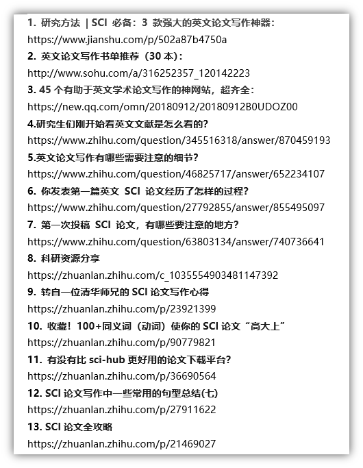 But!科研论文怎么写?往什么杂志发?投稿被拒怎么办?初学者往往无从下手,写作中的语言问题往往会难住很多人,SCI论文似乎成为大家科研路上难以逾越的山峰。有鉴于此,我们对SCI英文论文写作的相关资料进行了汇总和整理,内容包括文献管理软件及教程、论文撰写书籍、论文写作干货详情(实用工具、入门基础、论文写作、教学视频、投稿经验以及语法&词汇技巧)等,希望能对你的SCI论文写作提供参考,助力你的科研论文写作水平的迅速提高。
