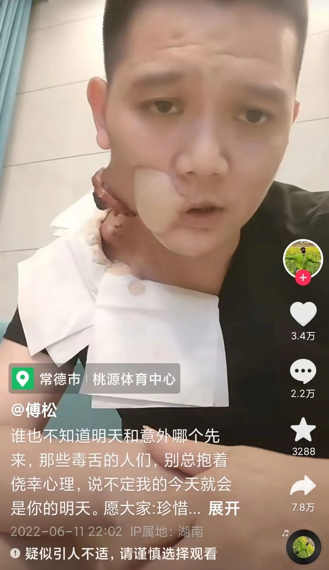 今年6月,傅松在个人主页上展示自己的伤口丨抖音@傅松