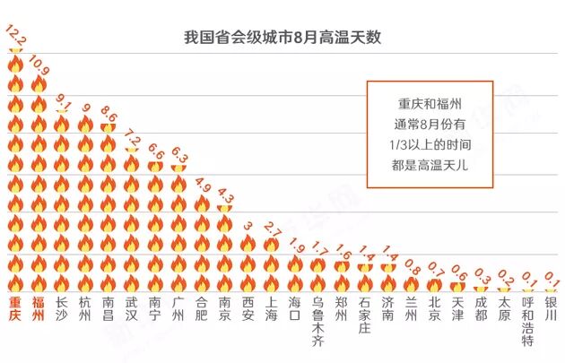 统计数据显示,常年8月份,高温势力仍然很强,省会级城市重庆、福州的8月高温天儿均占该月的1/3以上。