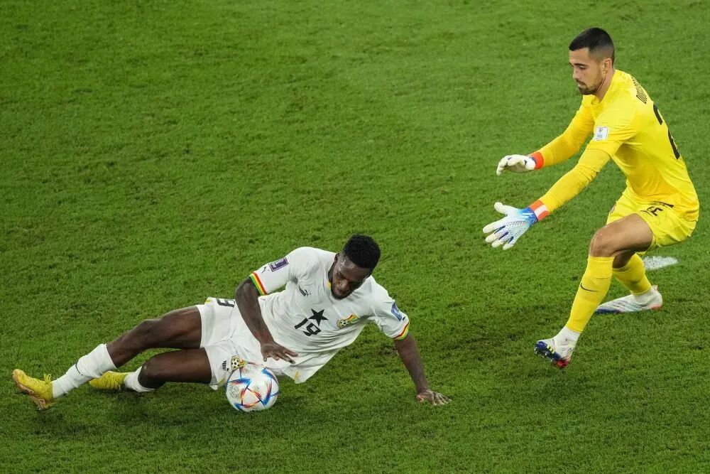 △加纳队球员威廉姆斯(左)在比赛中抢断葡萄牙队守门员科斯塔。