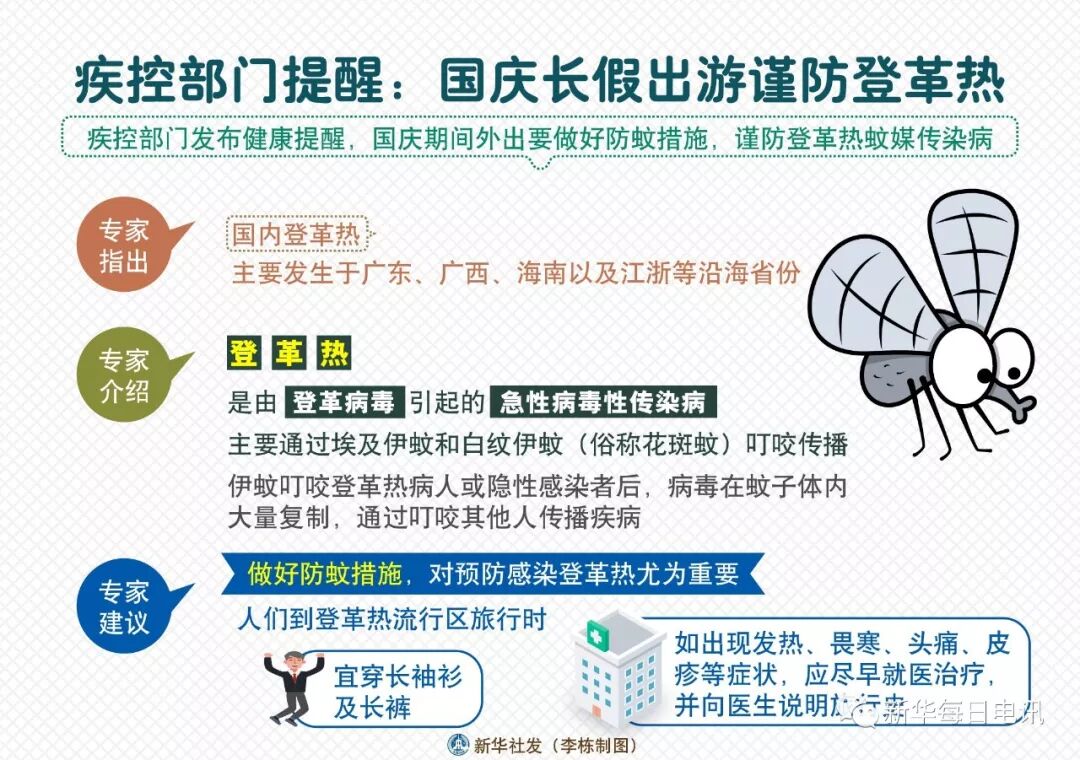 国庆长假期间,很多家庭和个人将前往南方旅行。为此,疾控部门发布健康提醒,国庆期间外出要做好防蚊措施,谨防登革热蚊媒传染病。