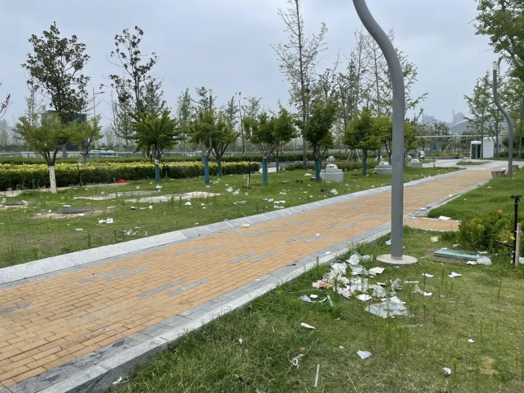 奥体中心夜市形成之初,很多摊位的门面都是“汽车后备厢”,贩卖的商品以提拉米苏、咖啡、手打柠檬茶,或是烤香肠等网红产品为主,摊位挂着彩灯以及设计过的招牌,整体风格小清新。慢慢随着“地摊热”,奥体中心夜市在社交平台曝光度增加,不少摊主也借此机会在抖音、小红书分享自己摆摊的日常和心得。随着热度攀升,奥体中心摊位开始供不应求,“专业商贩”出现,联排的帐篷架子、三轮车、餐饮车在夜市中占据了核心位置,周边开始出现大型儿童充气蹦床、套圈、电动火车,儿童游戏机等设备,甚至深夜收摊后也不离去。据商贩介绍,虽然当时这里免费摆摊,却有不少人售卖自己抢占的摊位,一个摊位卖到800元。随后,各种垃圾、油污开始变得不受控制,塑料袋、饭盒、竹签随意扔在草坪里,被清理出的垃圾如同小山堆放在角落,地面石材也被油污浸黑。![]()