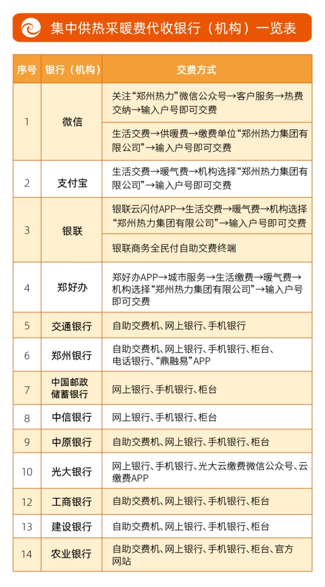此外,热费代收机构也开启收费模式,用户可持城市集中供热用户缴费卡到交通银行、中信银行、郑州银行、中国邮政储蓄银行、工商银行、中原银行、光大银行、建设银行、农业银行等9家银行代收机构缴费。