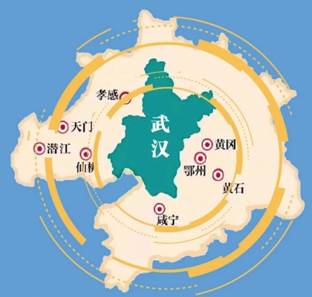 武汉都市圈 ,又称武汉"1+8"都市圈,除了武汉,范围囊括了黄石、鄂州、孝感、黄冈、咸宁、仙桃、天门、潜江等,面积5.78万平方公里,占湖北省1/3的国土面积。2021年,武汉城市圈总常住人口超过3300万,占全省人口的56%;GDP超3万亿,占全省生产总值的2/3。