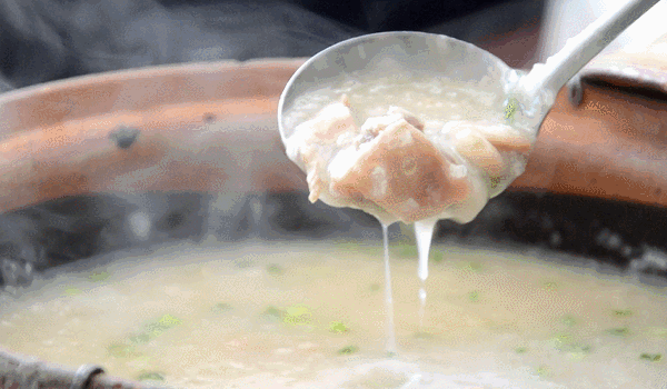 老火粥多用砂锅,将食材和米水同时放入煲中,粥底煮滚之后转为小火慢煲。和老火汤一样,老火粥经过长时间的熬制,粥底绵厚,米香浓醇。