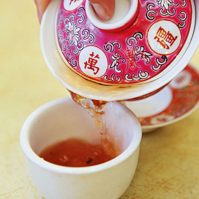 茶博士将滚水直接冲到茶盅里,盖上茶盖,为的是焗茶,逼出浓郁茶味。
