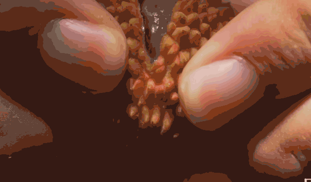 糯米糍最典型的就是肉厚味甜核还小,外表看着圆润饱满,圆乎乎的,刺较少,拿在手上没有那么棘手。双手拇指交叠对内压开外皮,“噗”地一下果尖裂开一条小缝。