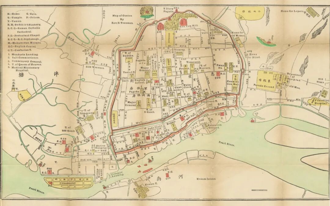 ▲1890年的广州地图,红框内是广州城,西边是西关