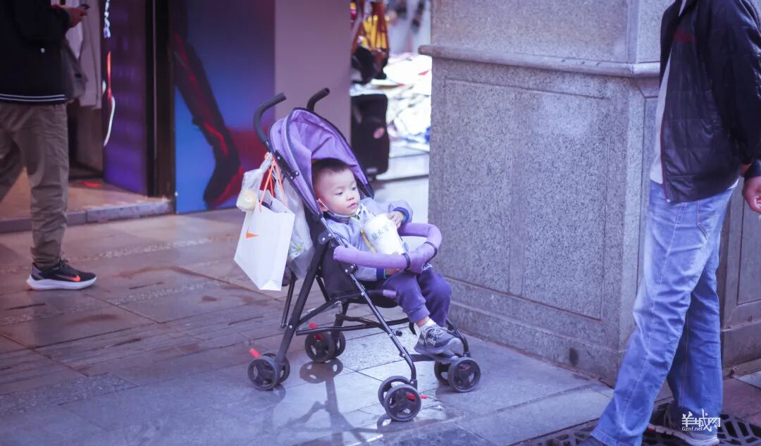 还有很多带着孩子的家庭来到这里游玩,可能是冲着这里有童装店,也可能是因为这里路面平整宽敞适合推婴儿车。