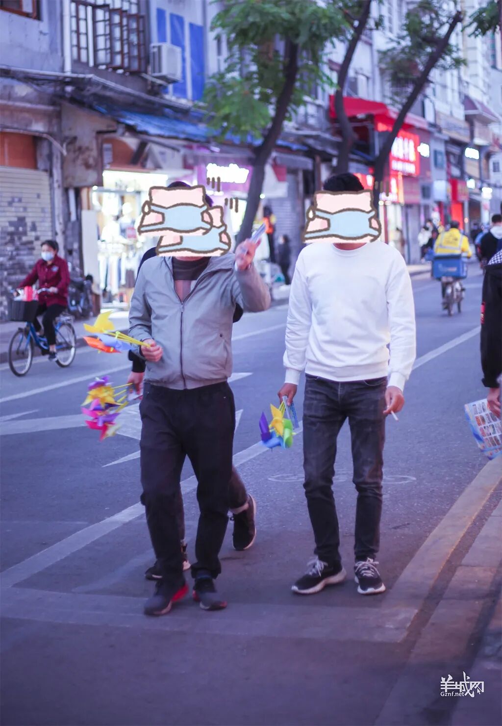 路上还有很多中年大叔拿着风车,看见年轻人,特别是单独行走的女生,会凑上去让人扫码做任务。